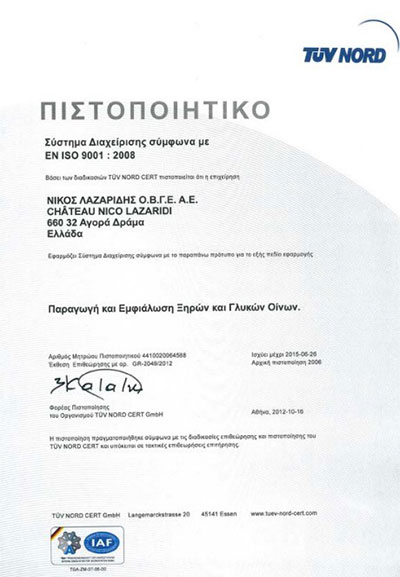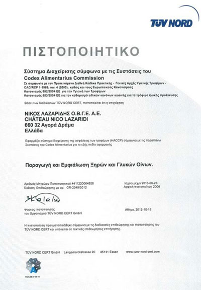 Η δημιουργία υψηλής ποιότητας κρασιών που διακρίνει τη NICO LAZARIDI είναι άρρηκτα συνδεδεμένη με την τήρηση υψηλών ποιοτικών προτύπων, που υπαγορεύει η τέχνη της αμπελουργίας, της οινοποίησης και οι ενδεδειγμένες διαδικασίες τυποποίησης των προϊόντων μας, τα οποία πιστοποιούνται από την TÜV HELLAS μέσω του Συστήματος Διασφάλισης Ποιότητας ISO 9001/2008 και του HACCP.